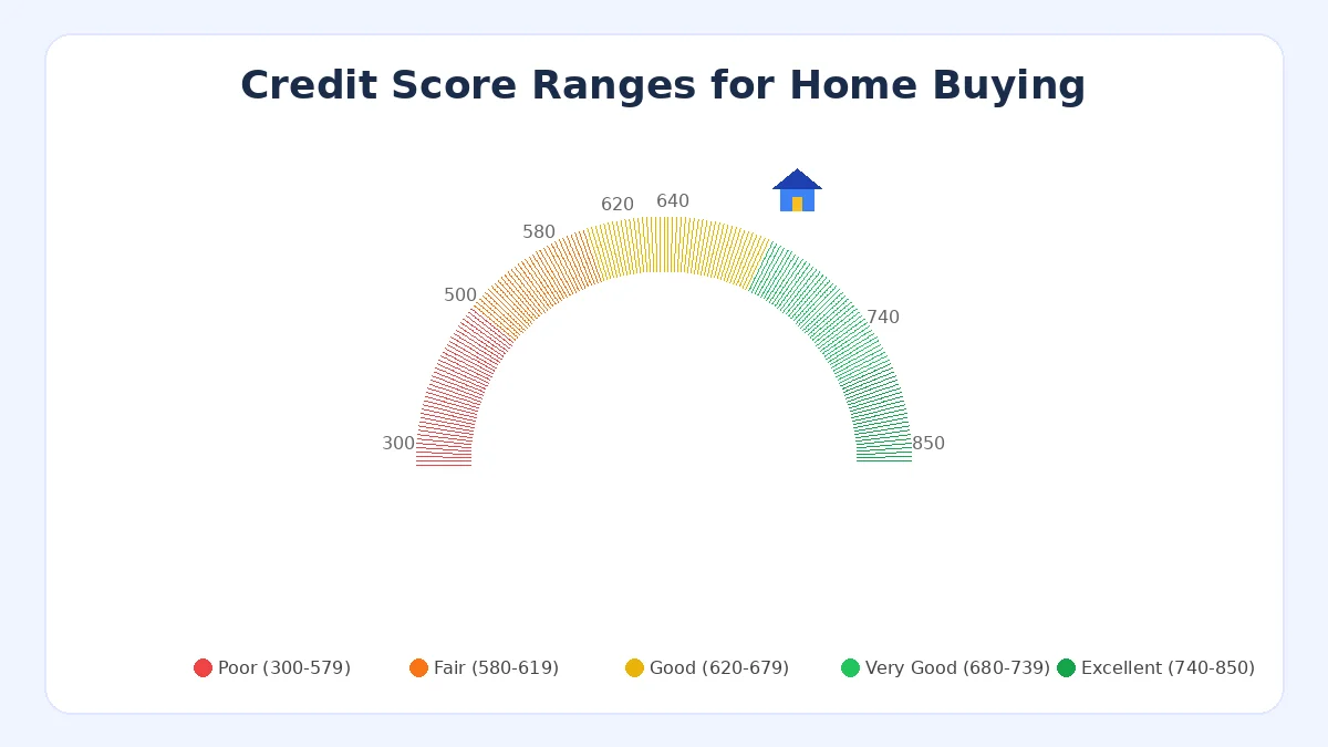 The minimum credit score depends on the loan type. FHA loans allow scores as low as 500 with a 10% down payment, or 580 with 3.5% down. Conventional loans typically require 620. VA and USDA loans have no government-mandated minimum, but most lenders prefer scores of 580 to 640.